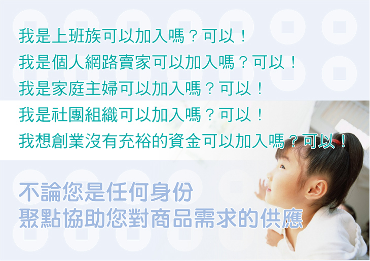 無經驗? 無資金? 無管道? 聚點就是您現成的團隊,讓我們幫助您走向您的創業之路吧!我們能提供您商品介紹的宣傳使用權、網路行銷實戰操作的寶典、聚點實體店面取貨地點,同時也是產品庫存倉庫空間。我們的產品是來自世界各地不同國家的知名品牌玩教具,從嬰幼兒生活用品、啟蒙與感統玩具、學齡教具、休閒娛樂用品、創意美勞DIY材料、科學知識培養寶盒、親子關係培養桌遊等等,從出生的育樂到成年後的休閒娛樂都在聚點可「一站購足」,您擁有上萬個商品可自由彈性選擇,無論您需要什麼商品,只要有聚點就能成!