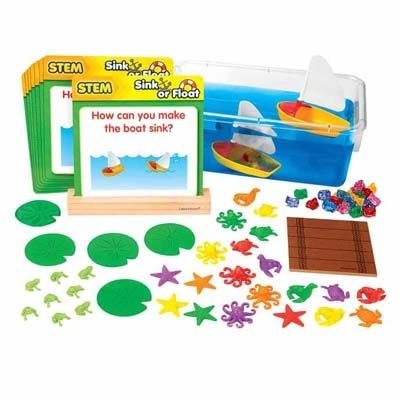 內含8張學習卡、水箱、2艘帆船、5片荷葉、8隻青蛙及20隻海洋生物船浮在水面如何讓他沉到水底?