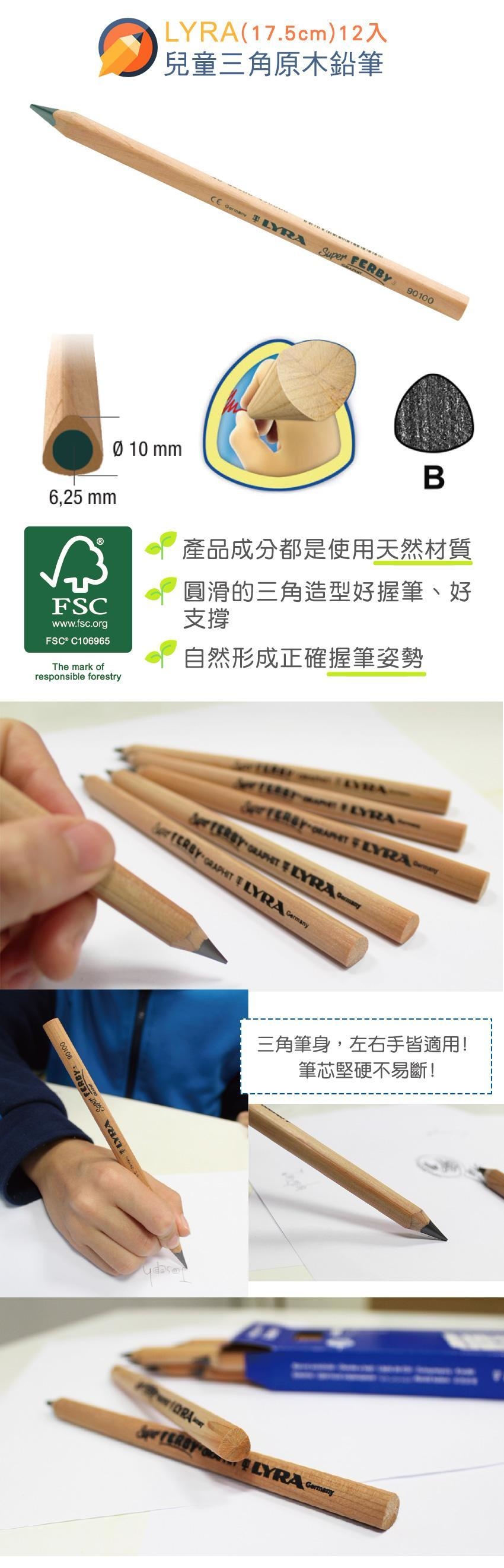 好握的圓滑三角造型、筆芯堅硬不易折斷純天然木材製造、鉛筆芯直徑是一般鉛筆的3倍!