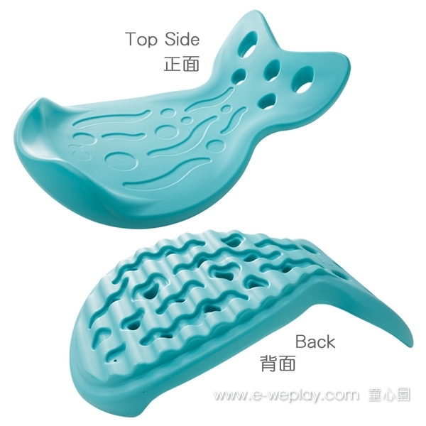 1. 以跳躍的魚為設計概念,表面有著象徵水流、泡泡的紋路,提供幼兒腳部觸覺感官刺激,也給予幼兒魚在水裡悠游的畫面想像。