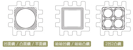 組 件:凹面鏡、凸面鏡、平面鏡、哈哈凸鏡、哈哈凹鏡、2凸2凹鏡積木各1片,共6片