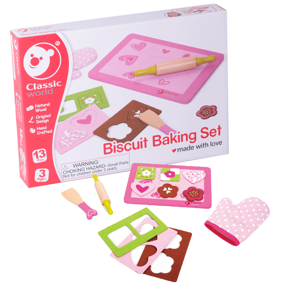 蛋糕廚具組內有 6 片可口的蛋糕、蛋糕模型、烘培手套、硯板、滾筒和木刀,
